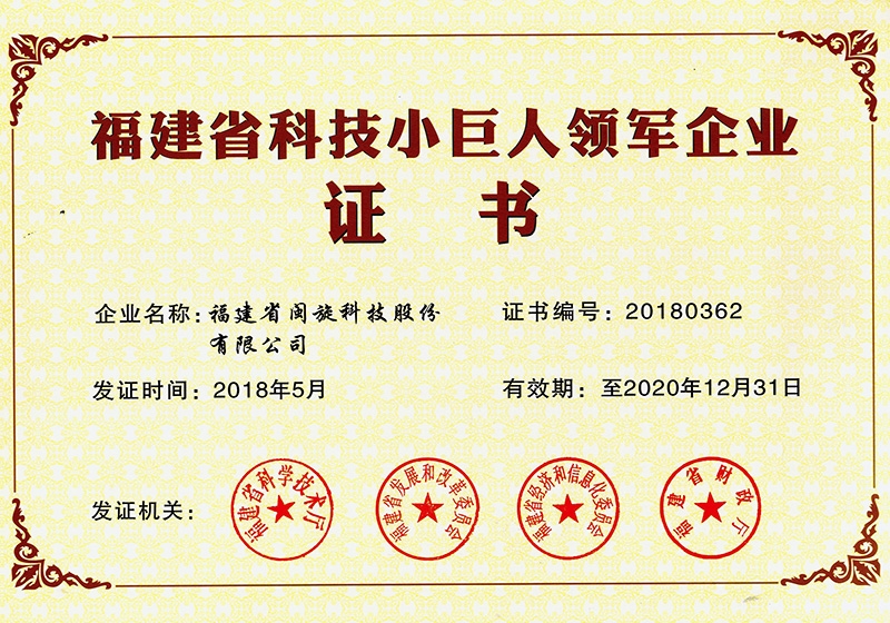 福建省科技小巨人領軍企業證書