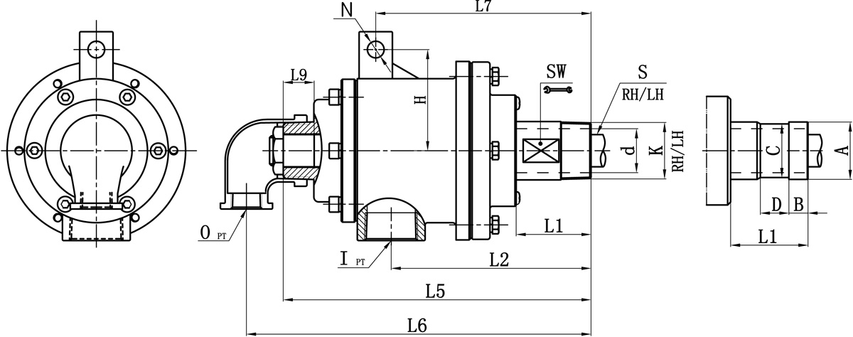 Model | K | I | O | S | d | L1 | L2 | L5 | L6 | L7 | L9 | N | H | SW | 法蘭式外管尺寸對照表 | |||