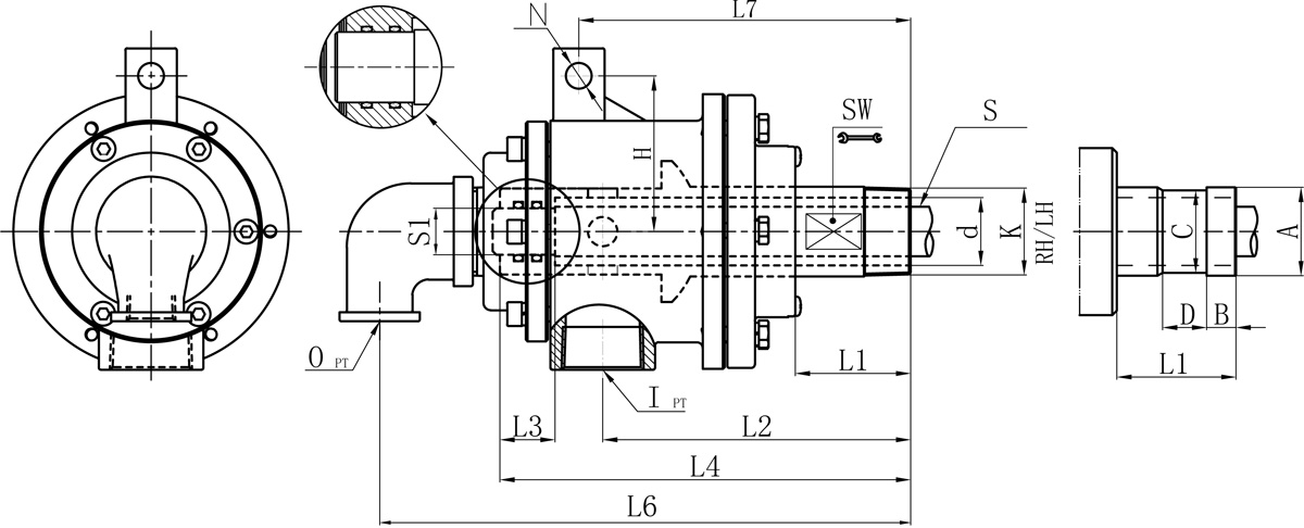 Model | K | I | O | S1 | d | L1 | L2 | L3 | L4 | L6 | L7 | N | H | SW | 法蘭式外管尺寸對(duì)照表 | |||